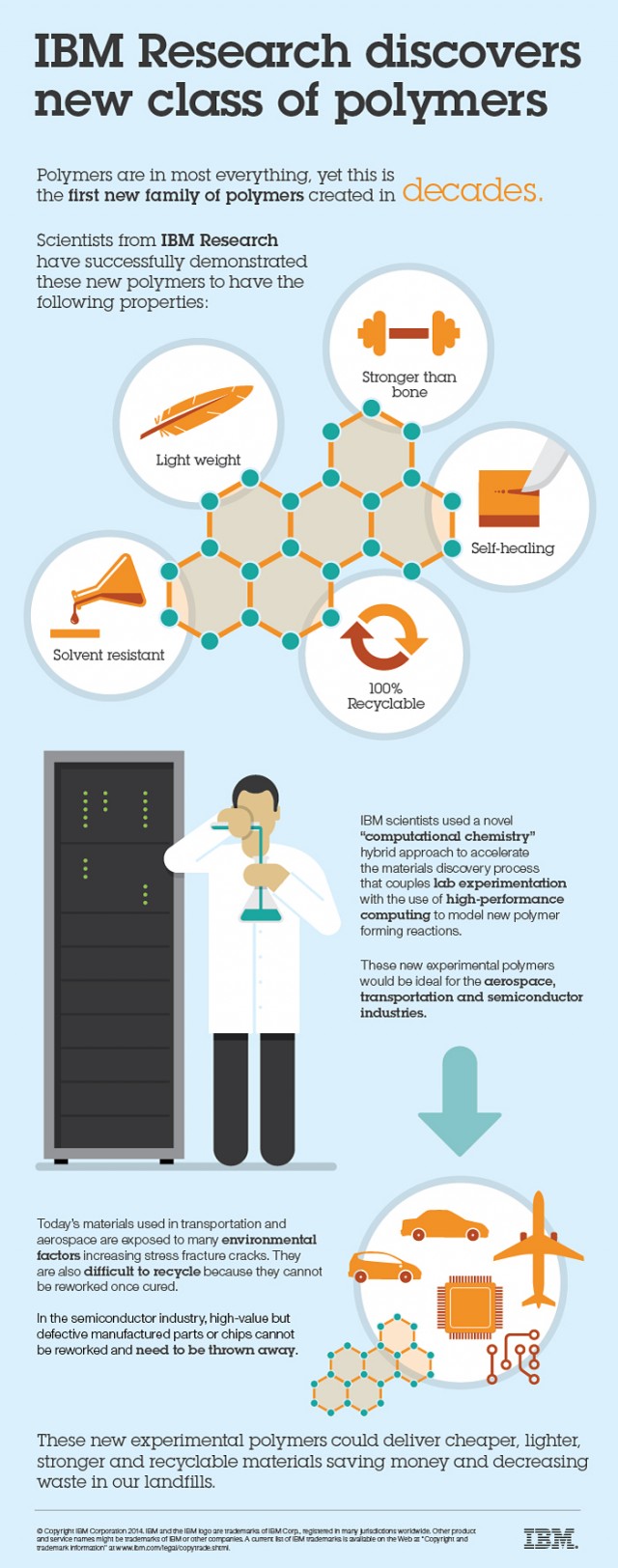 Stop the press! IBM Research announced this morning that it has discovered a whole new class of… plastics. This might not sound quite as sexy as, say, MIT discovering a whole new state of matter — but wait until you hear what these new plastics can do. This new class of plastics — or more accurately, polymers — are stronger than bone, have the ability to self-heal, are light-weight, and are 100% recyclable. The number of potential uses, spanning industries as disparate as aerospace and semiconductors, is dizzying. A new class of polymers hasn’t been discovered in over 20 years — and, in a rather novel twist, they weren’t discovered by chemists: they were discovered by IBM’s supercomputers.