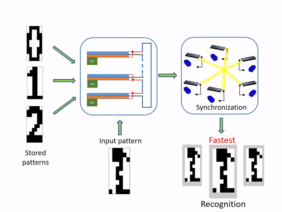 The computational modeling revealed that the input pattern closest to the stored pattern exhibits the fastest convergence time to the stable synchronization behavior, and is the most effective at recognizing patterns. In this study, the materials were programmed to recognize black-and-white pixels in the shape of numbers that had been distorted.