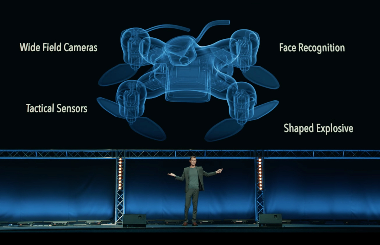 In a dystopian world a new form of A.I. weaponry has been created. All these drone bots need is a profile: age, sex, fitness, uniform, and ethnicity. Nuclear is obsolete. Take out your entire enemy virtually risk free. Just characterize him, release the swarm, and rest easy.