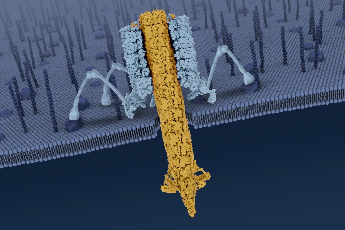 Earlier research by the leaders of the new study described the pyocin’s overall structure, albeit in less detail. The largest part of a pyocin is a cylindrical trunk comprising an outer sheath that surrounds an inner tube—the part that punctures. At the bottom of the trunk is a baseplate with six protruding tendrils. When the nanomachine encounters a bacterial cell, it lands on the cell and the tendrils bind to specific structures on the cell’s surface.